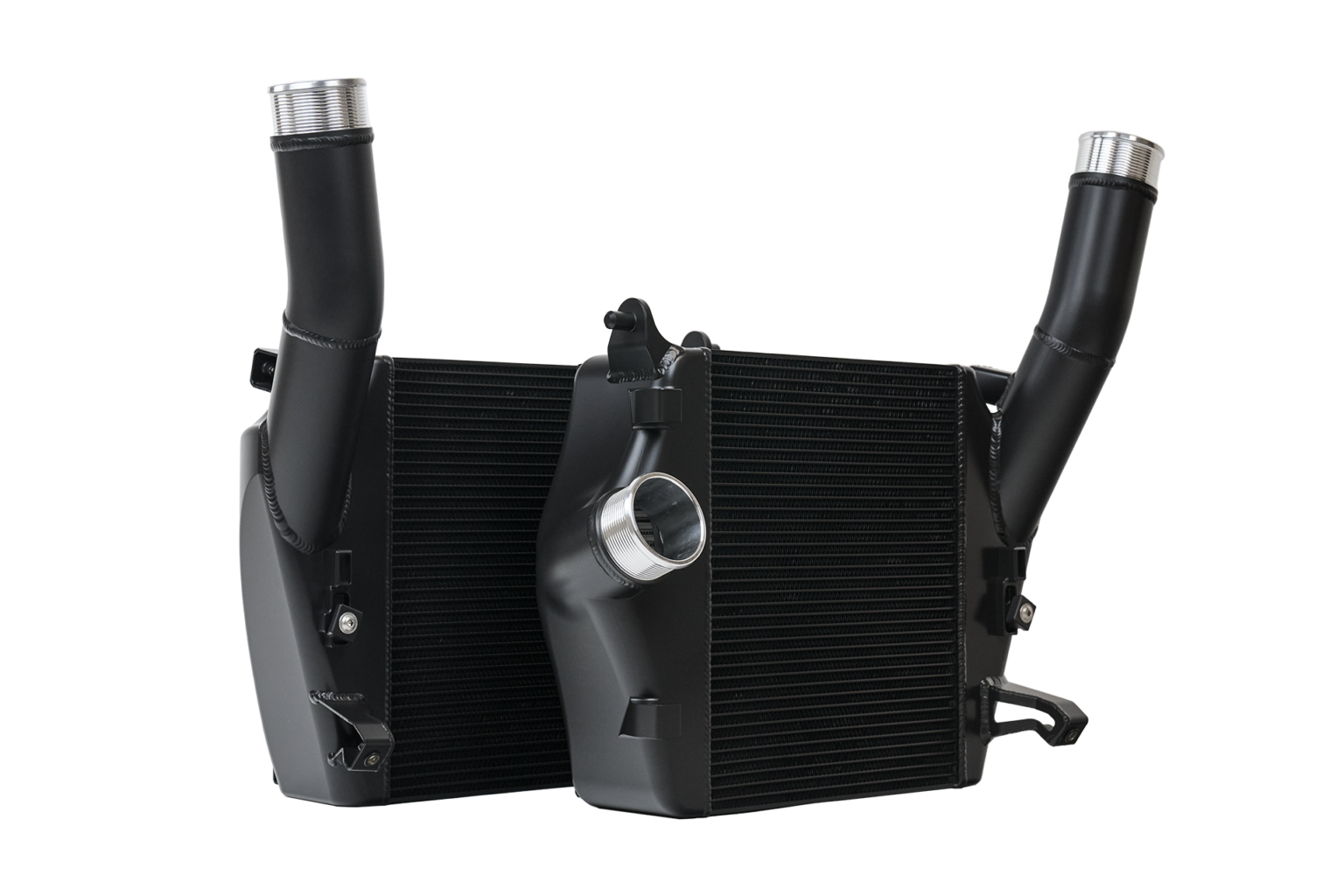 There are two available finishes for the intercoolers. A raw billet aluminum finish or Thermal Black Heat Dispersion Cerakote to further the cooling efficiency of these Intercoolers. The Thermal Black coating is able to dissipate heat about 15% faster than raw billet.