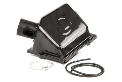 The Dinan carbon fiber intake for the MINI B46/B48 engines (as well as the BMW F48 X1 and F39 X2) is tantamount to an exercise in efficiency. Given a confined space with limited options and an even smaller budget; create an intake that provides power, sound, and throttle response in an aesthetically pleasing package. While not the easiest of things to accomplish, we embarked upon the task with our team of engineers determined to provide a solution. Through a bevy of flow bench testing, it was quickly determined that the biggest hindrance to improved flow on the stock intake was the factory snorkel. Unfortunately, the snorkel also was the piece that would cause the largest increase in cost to a potential kit. As a result, it was quickly abandoned as a potential area of improvement. Instead, attention was turned to finding a way to introduce a secondary inlet for additional airflow. With limited room to work with, traditional secondary ducting was not possible. This, in turn, led to multiple experiments being conducted on the effectiveness of a possible open-air inlet on the upper lid. With different shapes, locations, and sizes of openings being tested, the goal was to ensure that the added secondary inlet did not cause any unwarranted side effects such as an increase in air temps in the system. This is commonplace with open-air intake systems where lots of overheated engine bay air is utilized in the intake tract. The results of these tests showed that a 12 square-inch opening for additional air on the opposite side of the upper lid from the engine provided a perfect balance of additional volume to assist the factory snorkel all the while not causing an increase in turbo inlet temperatures. This was the case regardless of testing conditions (single/multiple gear pulls, constant speed, 0-100mph runs, etc.). With more air being pulled into the system, throttle response is improved and additional power is realized in the form of max gains of +5 HP / +5 ft-lbs of torque. The secondary air inlet also allows the intake system to be more audible so the turbo spool and BOV can be appreciated. A stark difference from Dinan's traditional fully sealed systems where induction noise is not nearly as recognizable. Not to be outdone by the increased power and sound, the system is made of immaculate carbon fiber so it looks the role as well. The end result of an optimized lid, an improved filter, and thorough testing, yields an incredibly efficient and cost-effective solution that you will be hard-pressed to beat.